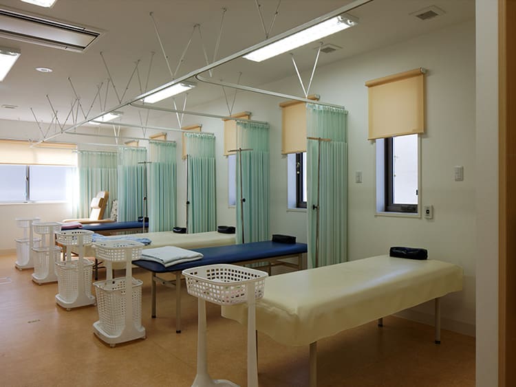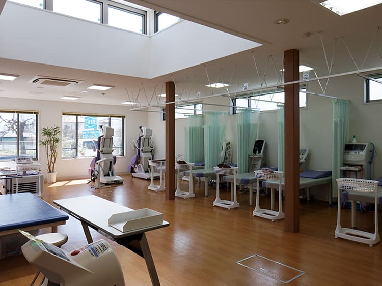 リハビリ室を明るくしたいという貴先生のご要望があったため、待合室と同じように上部吹き抜けにハイサイドライトを設置。吹き抜け部分は天井高5mとなっており、明るく開放感のある空間になりました。利用される患者さんからも「きれいで居心地がいい」という声をいただいています。