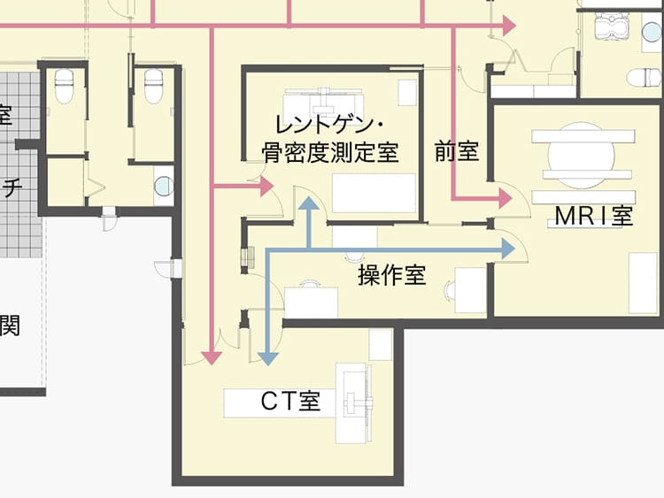 CT室、レントゲン室、MRI室の中央に操作室をプランすることで、作業効率向上と無駄のないスペースでのプランニングを実現しています。