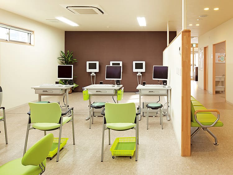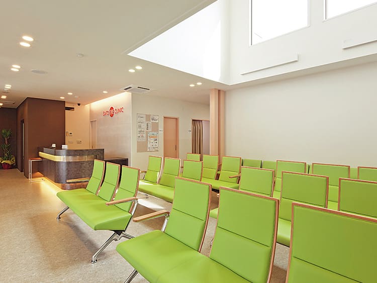 国道に面する北側の開口部を絞り、吹抜けの窓から採光を確保することで、静かさと明るさを両立した待合室。グリーンが印象的な椅子は、ドクターが座り心地を確かめて決められたそうです。