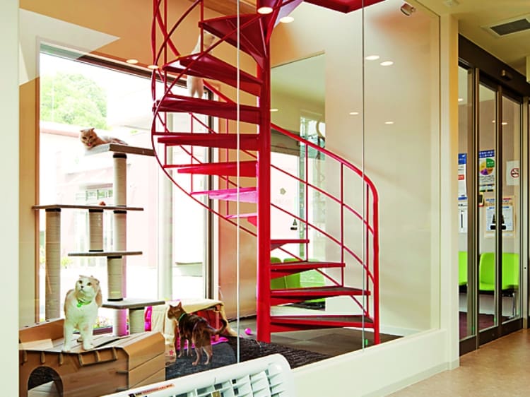 6匹の猫が気ままに遊ぶキャットスペースは、事務長である奥様のアイデア。患者さんを和ませる気配りです。診療空間とはFIXガラスで完全に分離されており、衛生面も万全です。