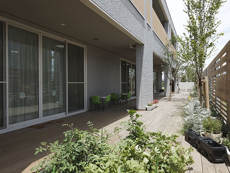 部屋を囲む大きな縁側「杜の回廊」には花や実ができる木々を、デッキやフェンスにはすべて国産材を。また、園庭「あそびの森」からは、運河やそこを往来する船が望められます。屋上には太陽光発電パネルを、園庭には風力発電システムを設置。エコなエネルギーが「見える化」された環境です。