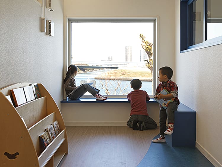 二階の大型のFIX窓からは東に面した運河が望め、廊下突き当りは園児が絵本などを読める空間に設えています。