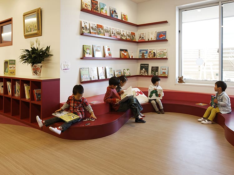 廊下の一角の絵本棚と読書スペース。柔らかい曲線の腰掛を設け、園児にも楽しい造りです。