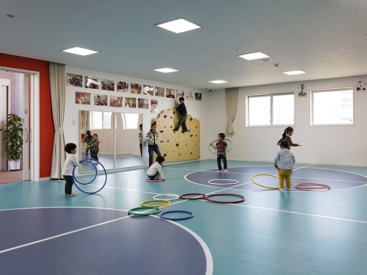 二階には子供達が元気いっぱいに走り回るのに十分な広さの体育館も設けています。