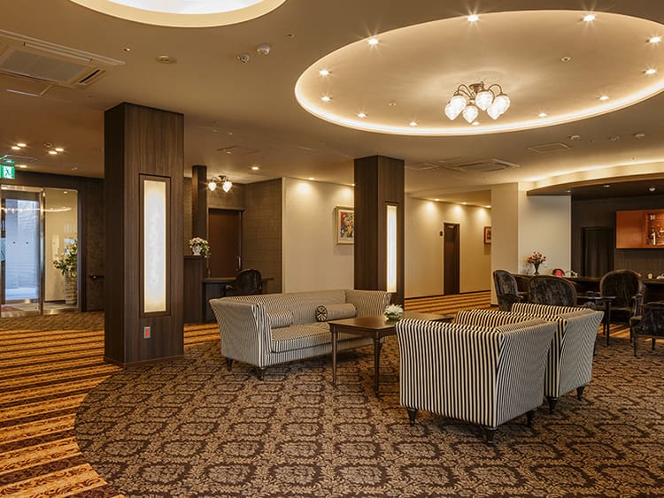 ホテルロビーのような1階ラウンジ。アール形状の化粧柱や使いやすい高さにこだわった調度品など、安全への配慮もさりげなく。
