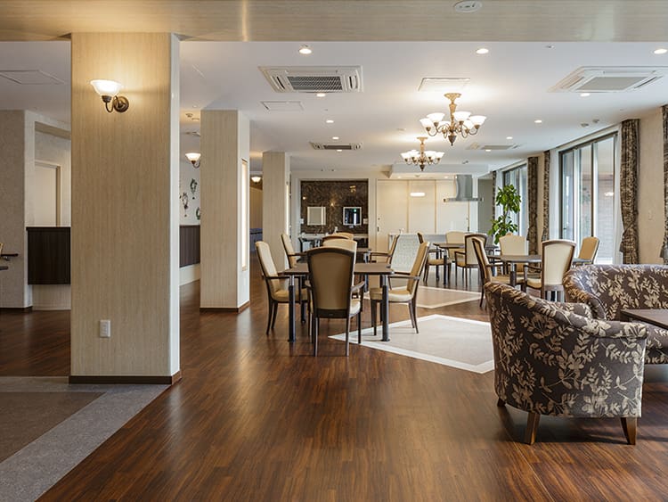 「ヴィラ・プランタン おかやま」に足を踏み入れると、そこは高級ホテルさながらの空間。堂々たる石張りのエントランス、重厚なインテリアが彩るラウンジ、季節を映す植栽など、細部にまで配慮の行き届いた設計は、ご家族の方からも高い評価を得ています。これまで上質な暮らしを存分に楽しんでこられた方々が「自分が暮らす場所にふさわしい」と思えるグレード感にあふれています。