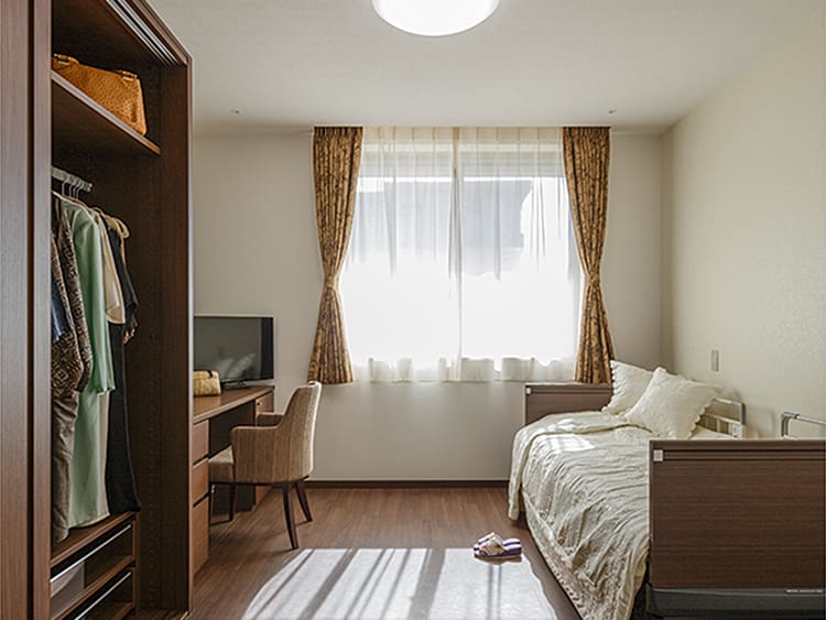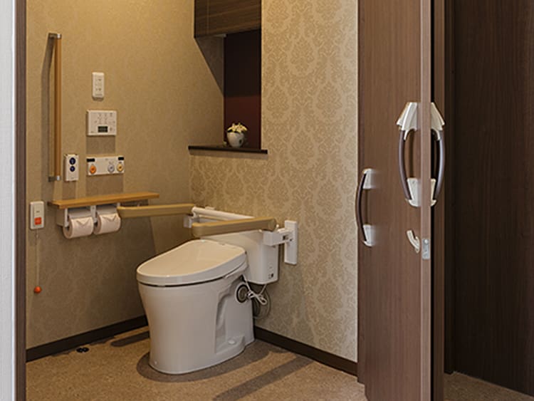 それぞれの居室には、メールボックスや大容量のクローゼット、シューズボックスやデスクなどを完備。落ち着いたインテリアで統一し、わが家としての心地よさを高めています。一方で、フルオープン可能なトイレドアや高さを変えられる洗面化粧台など、入居者の身体状況が変化しても暮らし続けられる環境を整えています。