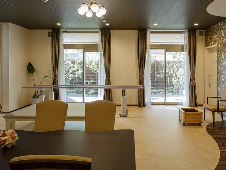 1階にあるデイサービスセンターは、認知症対応、一般対応、重度介護者対応と、利用者の身体状況に応じてパーテーションで分離。互いの視線を気兼ねせずに利用できるよう配慮しています。中四国初のレミニンシステム(回想法)や高性能リハビリ機器、リラクゼーション機器を導入し、自然な自立をサポートしています。