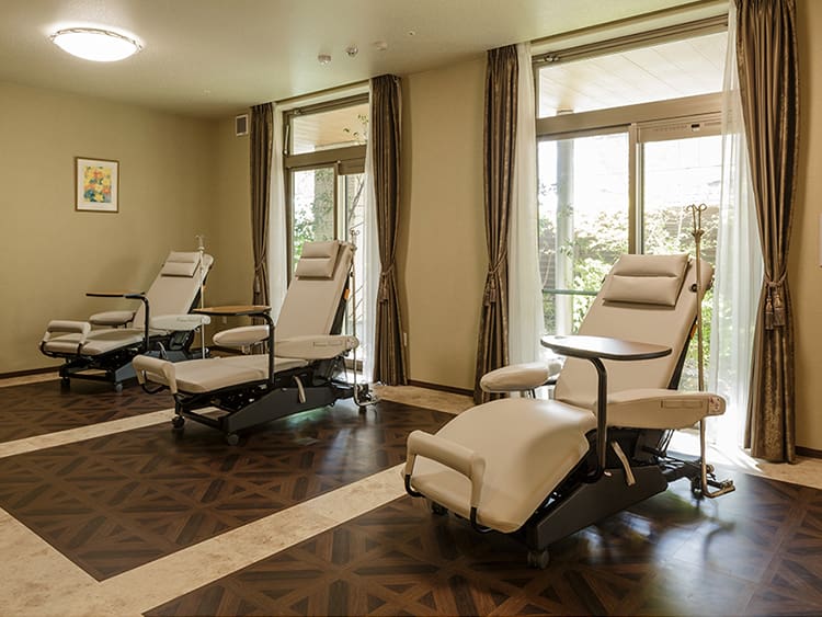 (デイサービスセンター)寝たきりの状態でもアクティビティに参加できるよう、フルリクライニングチェアを完備しています。