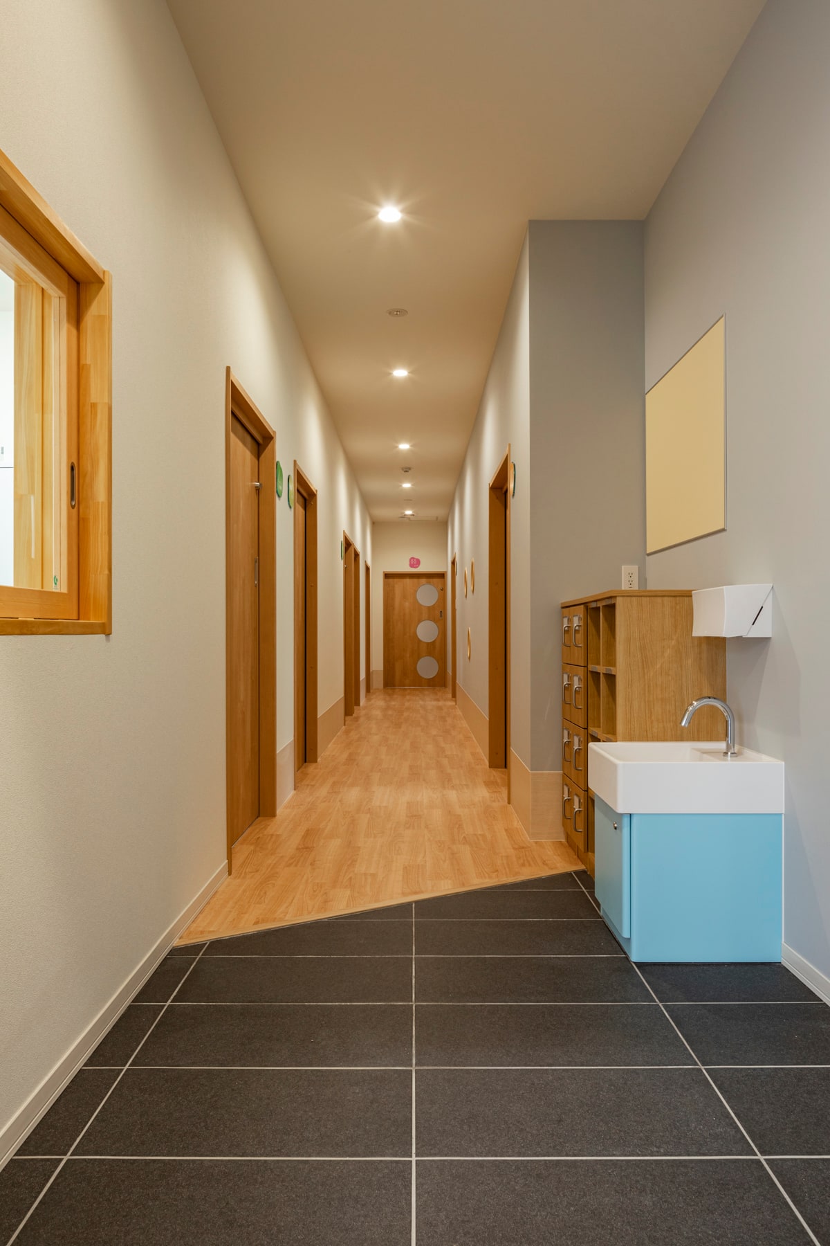 エントランスから各室へ続く児童発達支援の廊下は、移動がしやすいフラットな設計