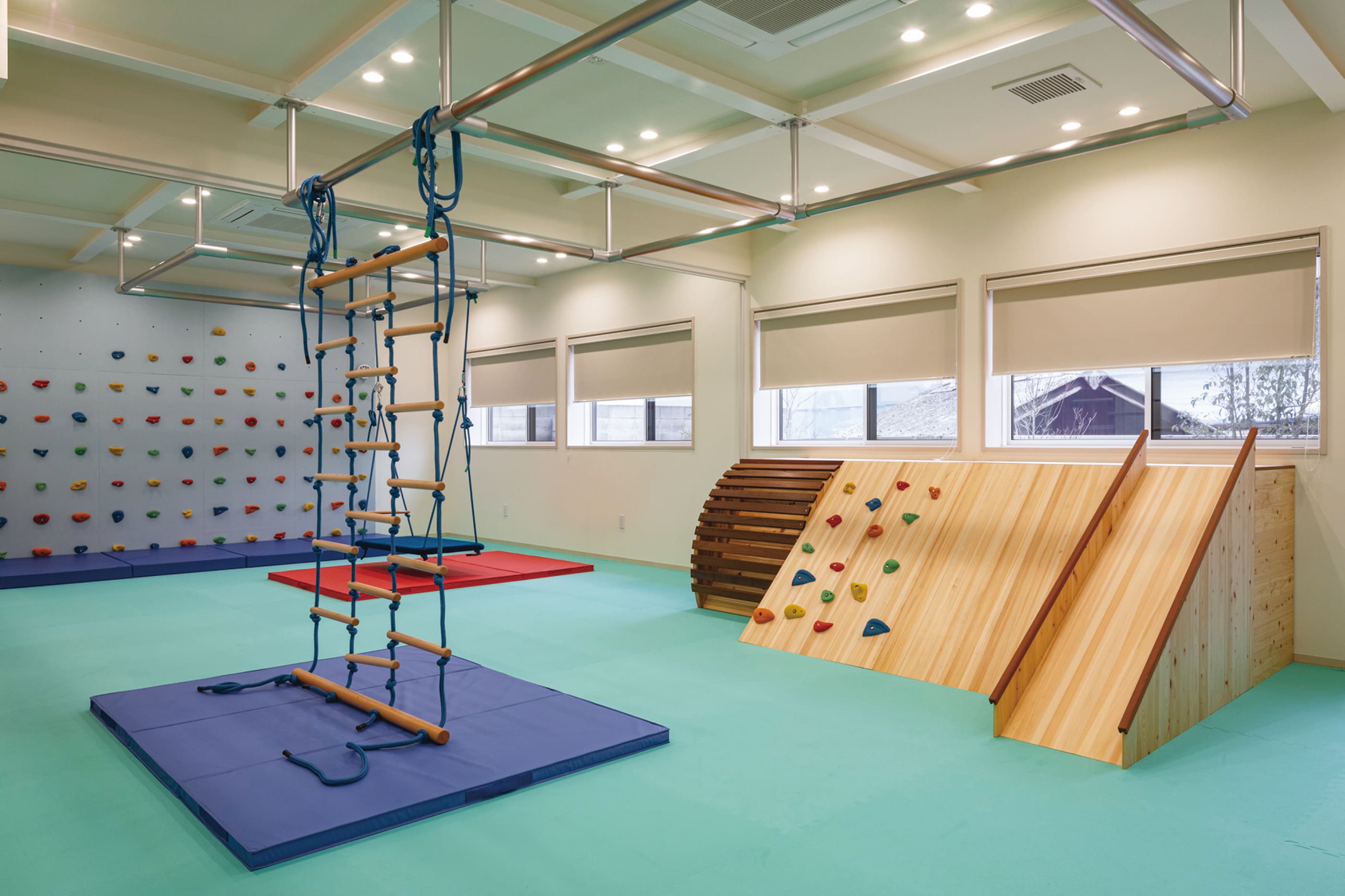 身体を動かして脳機能を高めるボルダリングなど、多様な使い方ができる児童発達支援の機能訓練室