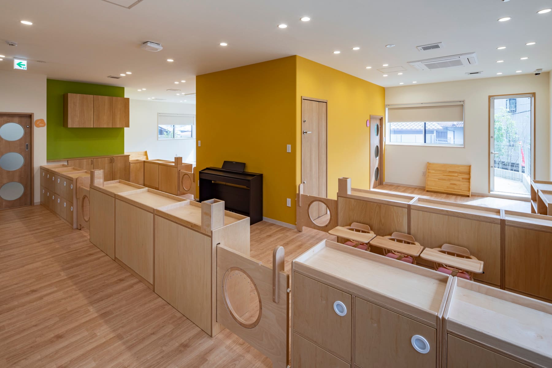 年齢による区画を設けながらも、オープンなつながりを感じられる保育所の保育室