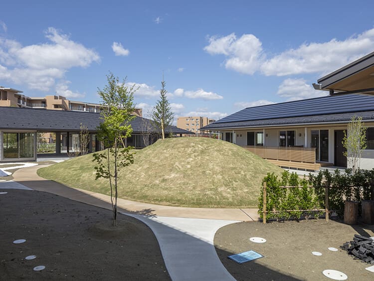 中庭。中心のシンボリックな2コブの築山は、子どもたちの格好のプレイマウンテンとなっている。周囲の建物から目が届きやすく子どもたちが安全に過ごせるように工夫している。
