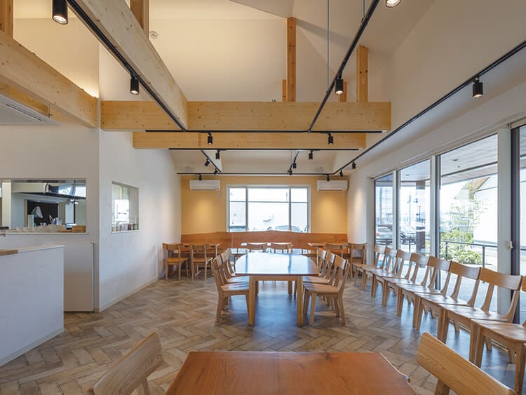 天井に梁をあらわした、あたたかい雰囲気のカフェ(就労支援B型)。中庭で走り回る園児を眺めながら桜や欅など地元の材料でつくられたテーブル·椅子で居心地良く過ごせる。