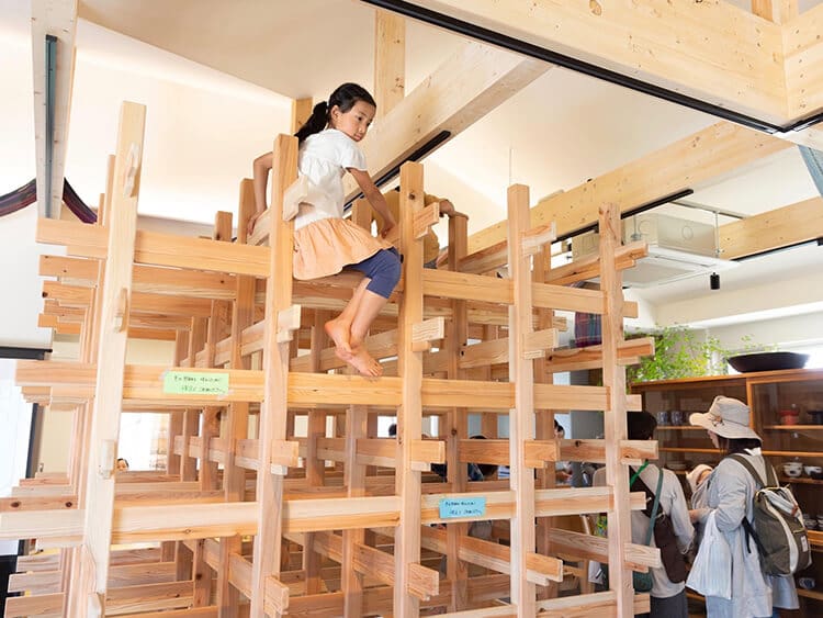 木組みの大工さんにつくってもらったノックダウン式のジャングルジム。手触り·足触りがよく子ども達に大人気。外に移動して使うことも出来る。