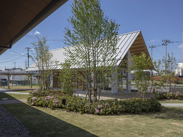 ノキシタの前庭。左がカフェ、右がコレクティブスペース。足元の低木や季節の草花の植え込みは地域ボランティアの方と共同作業によるもの。緑の成長や小鳥のさえずりを楽しみながら手入れをし、住宅街の雑木林を目指す。