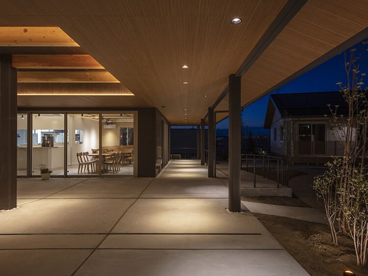軒下空間から見る中庭。小径がつなぐ居処に囲まれている。