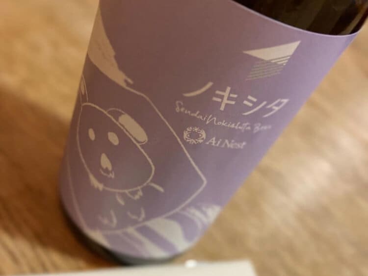 “ノキシタのはたけ”で育てたホップを使用した「Sendaiノキシタビール」。新鮮なホップを使用することにより香り高いビール。ラベルイラストは知的障がいがあるノキシタ関係者の作品。
