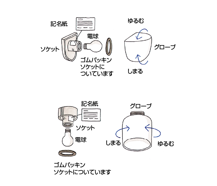 - ゴムパッキンをはみ出したりねじれたりしないようにきちんと装着し、照明グローブを取り付けてください。