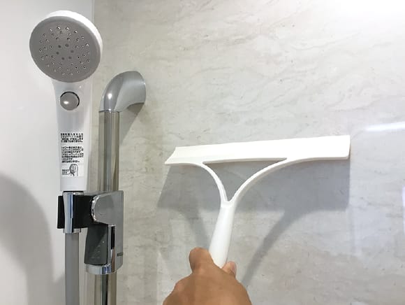 毎日の入浴後は、浴槽の栓を抜き(またはふたをして)、シャワーで熱い湯を浴槽や洗い場、壁などにかけて、スポンジで優しく汚れを除去します。汚れを除去したら冷水を浴室全体に回しかけて、室内の温度を常温程度に下げます。 さらに水切りワイパーや大きめのタオルなどを利用して、水気をなくすことで水あかの付着防止や湿気低下につながります。