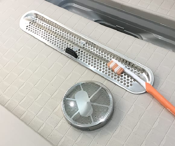 汚れがひどいときにはキッチンペーパーを敷き込んで洗剤を塗布し、20分くらい時間を置いてから、汚れを浮かび上がらせてブラシ清掃すると有効です。