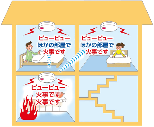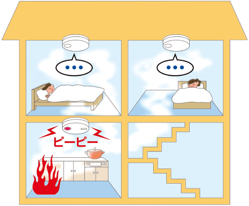 「単独型」の場合、火災を感知した警報器のみが警報を発するため、火災元以外の部屋では警報が聞こえにくく、特に別の階で発生すると、警報を発するまでに数分から数十分かかることがあります。