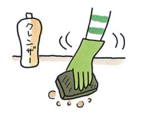 しつこい汚れにはメラミン研磨スポンジを使用して、汚れを削り落とします。ステンレス、人造大理石のどちらにも 使用できますが、こすり過ぎると表面の光沢が変わることがあるので、力の入れ過ぎに注意してください。