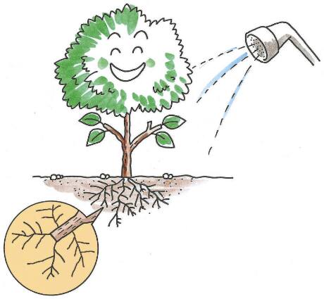 植物細胞に含まれる水分は70〜90%で、ほとんどが水分だといえます。植物のからだの中で水分は養分を溶かし、その養分を運び、蒸散させて体温を調節するなどの重要な役割を果たしています。植え付け直後は、大事な水分を体に取り込むための根が切られていたり、傷ついて十分に回復していなかったりするので、とてもデリケートで乾燥に弱くなっています。水分を取り込む細い根は、水不足で一度乾燥してしまうと、水をあげても復活することはありません。