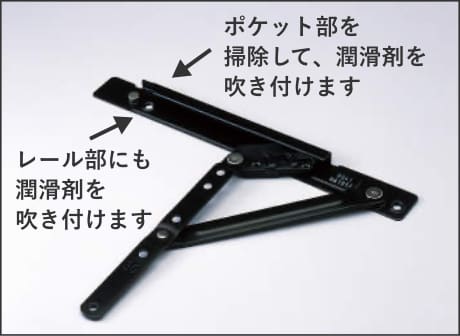 フリクションステーのポケット部とレール部に潤滑剤(テフロン配合高性能潤滑剤、シリコンスプレーなど)を吹き付けます。
