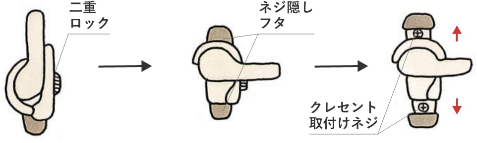 - 特にクレセント部は使用頻度も高いことから、ネジの緩みなどが発生しやすい箇所です。がたつきがある場合は、早めに締め直してください。