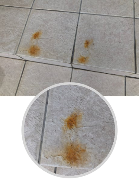 洗面カウンターやキッチンシンク、玄関タイルなどの茶色い汚れ。