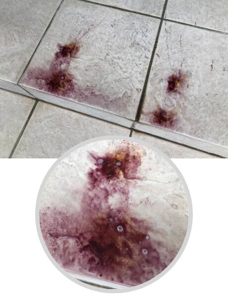では、どうすれば落とすことができるでしょう?答えは「化学の力(化学反応)」を利用することです。チオグリコール酸アンモニウム入り洗浄剤を使います。チオグリコール酸アンモニウムは酸化鉄(さび)を還元する効果があり、洗剤を塗布し還元された茶色いさびは「紫色」に変色します。