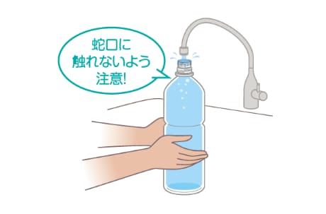 水が出はじめて約20秒たってから、容器を蛇口に近づけて(ただし蛇口に触れないよう注意)、水がなるべく空気に触れないようにして少しあふれるくらいまで注いでキャップを締める。