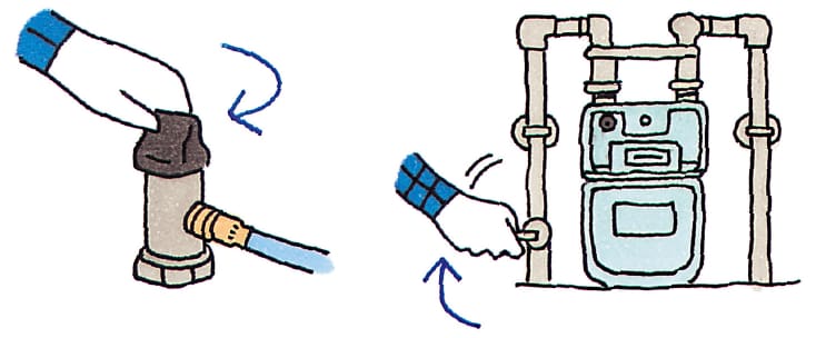 - 地震がおさまってから、ガス機器の器具栓を閉め(消火)、ガスの元栓も閉めてください。