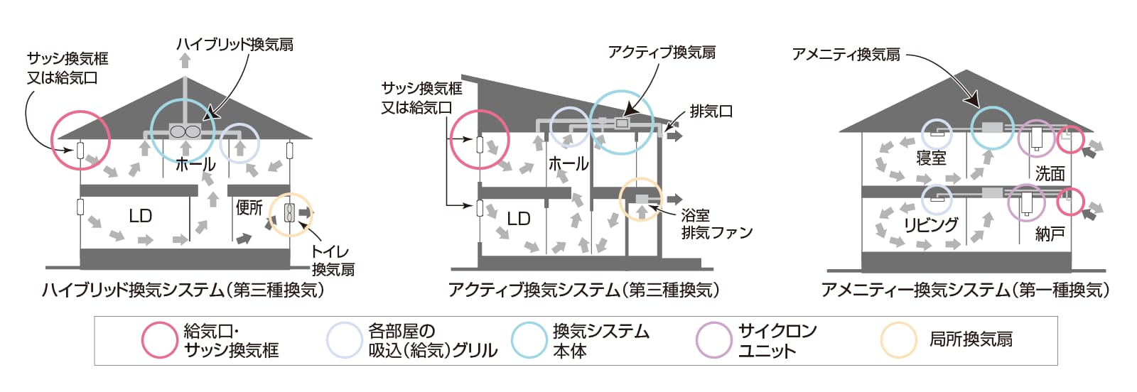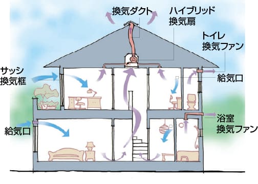 キッチンの換気扇などの局所換気は、調理など必要に応じて使うものですが、ハイブリッド換気システムなど建物全体の換気システムは、綺麗な空気で生活するための最低換気量を確保するものです。