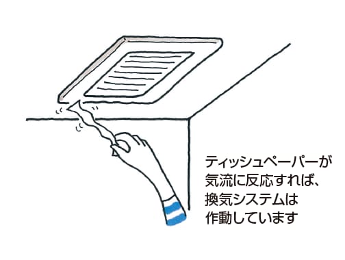 空気のよどみを感じる場合は、換気システムが作動しているか確認しましょう。天井面の吸込(給気)グリルに細く切ったティッシュペーパーなどを近づけて気流の有無を確認してください。作動していない場合は故障の可能性がありますので、カスタマーズセンターにご連絡ください。
