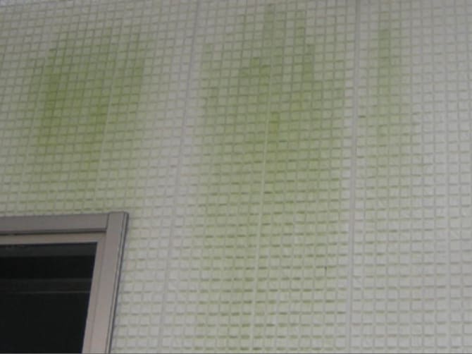 藻汚れは北面の雨掛かりの多い部分から発生しがちです。また、周囲に緑が多く、湿潤な立地環境ほど発生しやすくなります。放置すると一面に広がって取れにくくなりますが、早い時期ならこすり洗いで落とすことができます。