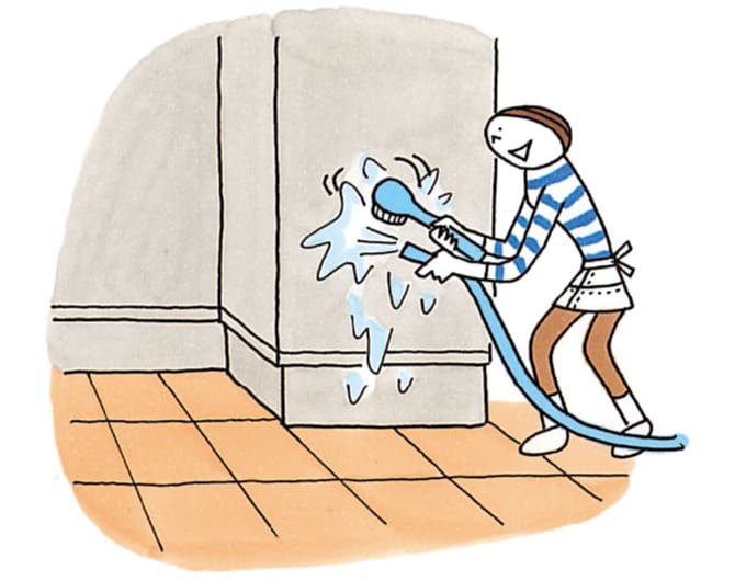 外壁に土ぼこりが目立ってきたら、ホースで水をかけ、洗車用ブラシなどで水洗いしましょう。
