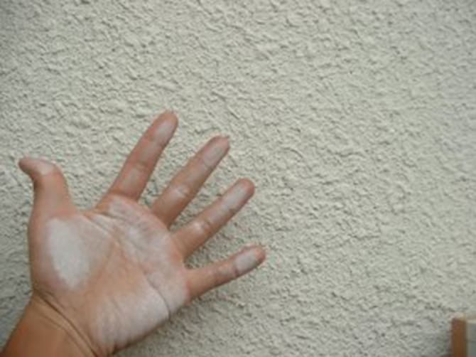 外壁表面に付着している汚れであれば性能上の問題はありませんが、外壁表面を手でこすって白い粉がつく場合は、塗膜が劣化しているので再塗装のご検討が必要です。