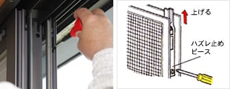 網戸はハズレ止めピースで固定されています。ハズレ止めピースは網戸上部の側面、左右2カ所にあり、そのピースをドライバーでゆるめ、下げます。