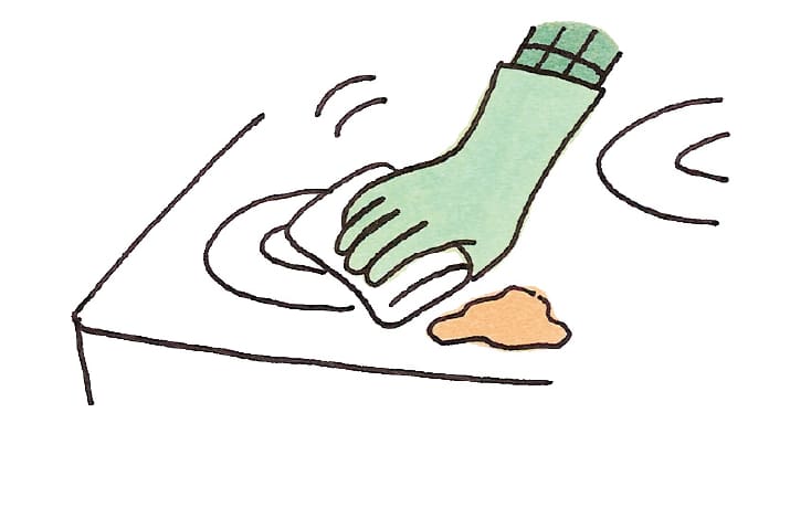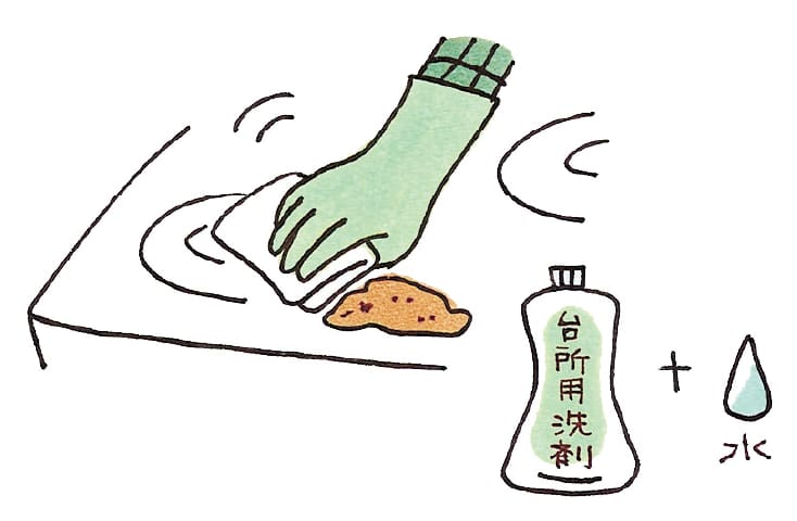 絞ったふきんで拭き取ります油汚れ:薄めた台所用洗剤(中性洗剤)をふきんにしみ込ませ、ていねいに拭き取ります。