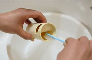 排水トラップを取り出し、中にたまっている水を洗面器やバケツに出します。 糸くずなどを取り除いて、歯ブラシで汚れを落とします。