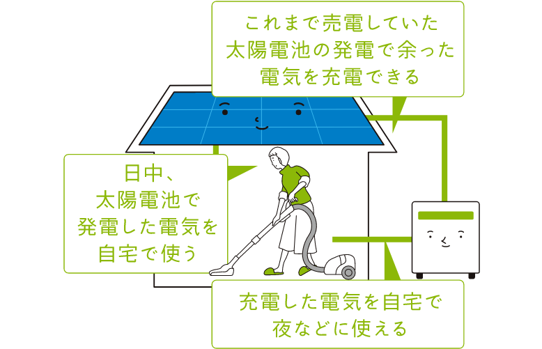 電気代は年々上がる傾向にあります。このため太陽電池で創った電気を自宅で使うことは、電気代の節約になります。そしてこれまで売電していた電気を蓄えて夜に使えば、光熱費の削減と環境にやさしい暮らしが実現。さらに災害時の停電に電気のある暮らしができます。