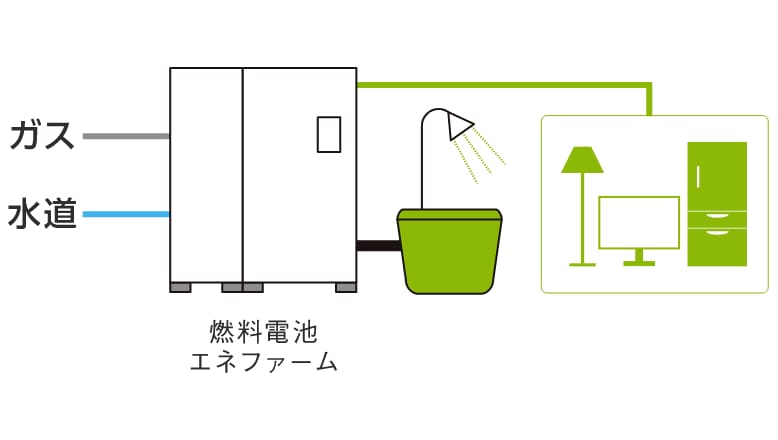 ガスを使って発電し、その時に発生する熱を利用してお湯を沸かします。停電時でも水道とガスの供給があれば、雨天時でも発電が可能で、入浴もできます。