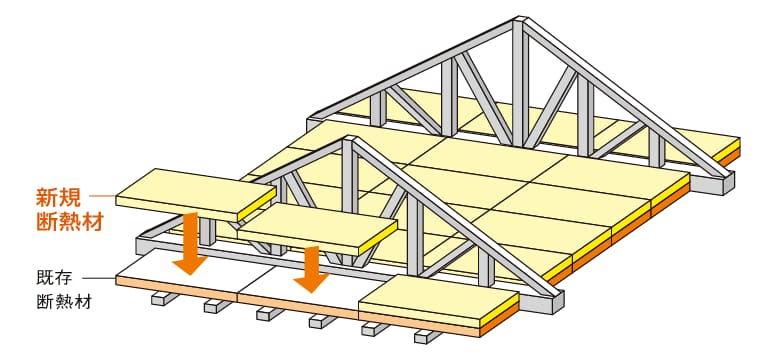 天井点検口から屋根裏に入って施工します。既にある断熱材の上に新たな断熱材を敷き並べ、天井の断熱性能を引き上げます。