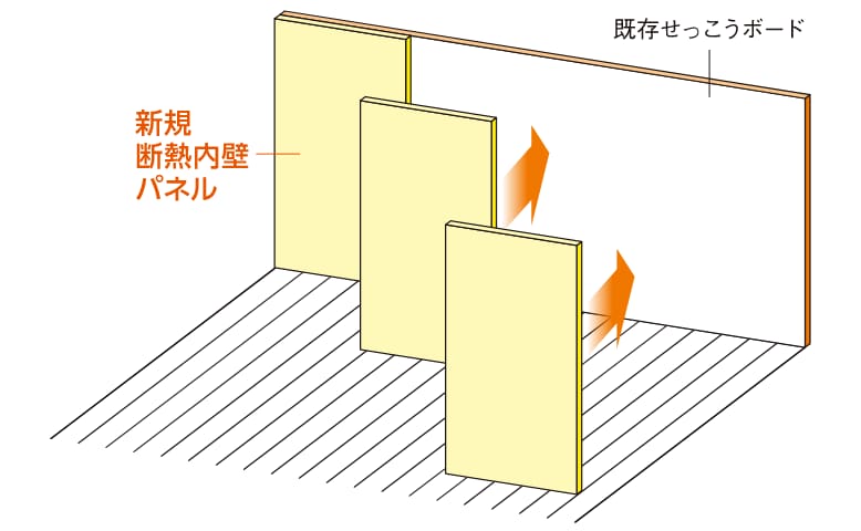 既にある室内側の壁を壊さずに、断熱内壁パネルを重ね貼りして仕上げます。
