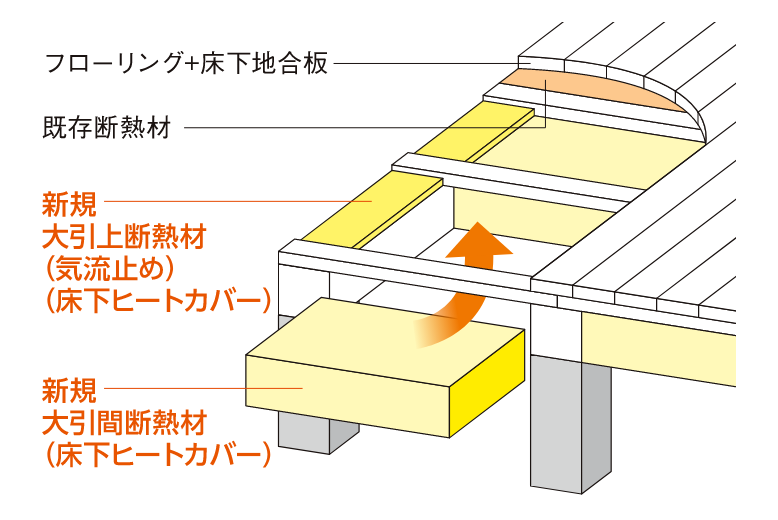 床を解体せずに、床下から断熱材を設置し、床の断熱性能をアップさせます。