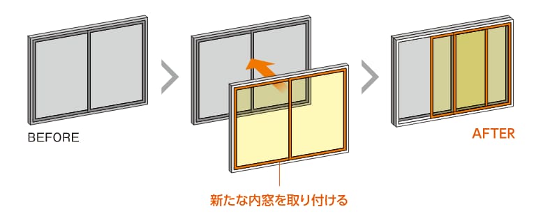 既存の窓の室内側に新たな窓を取り付ける工法。新たに取り付けた窓と既存の窓サッシの間にできる空気層によって高い断熱性能を実現します。