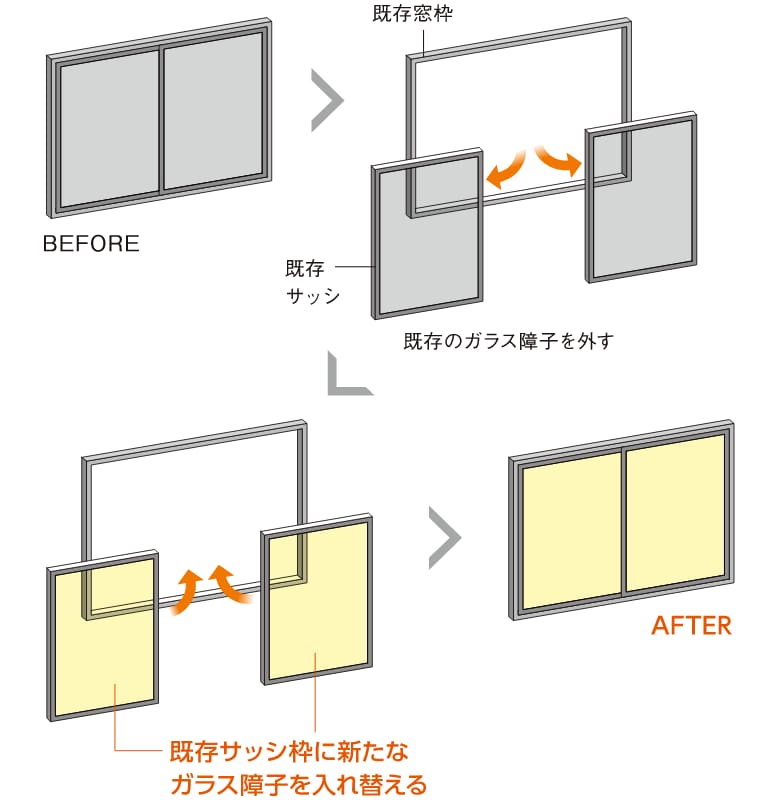 既存のサッシ枠は残したまま、ガラス障子を高性能複層ガラスに交換する、もっとも手軽な工法です。
