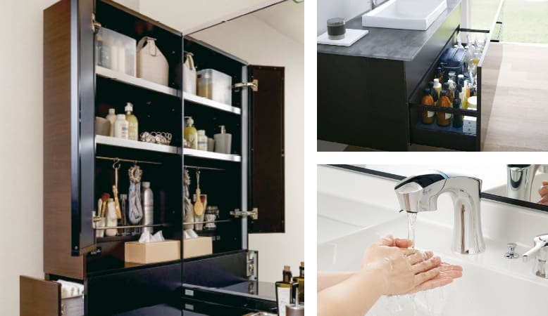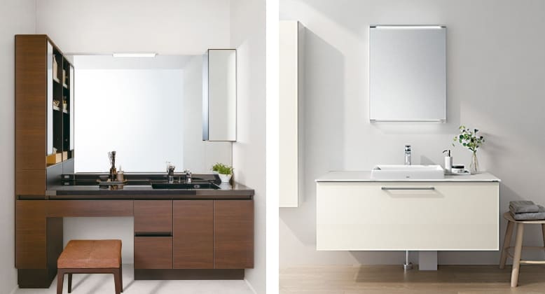 最新の洗面は意匠だけでなく、同じ間口でも広々と使えたり、座って作業できるタイプなど、機能とデザイン性に優れた洗面台をラインナップしています。